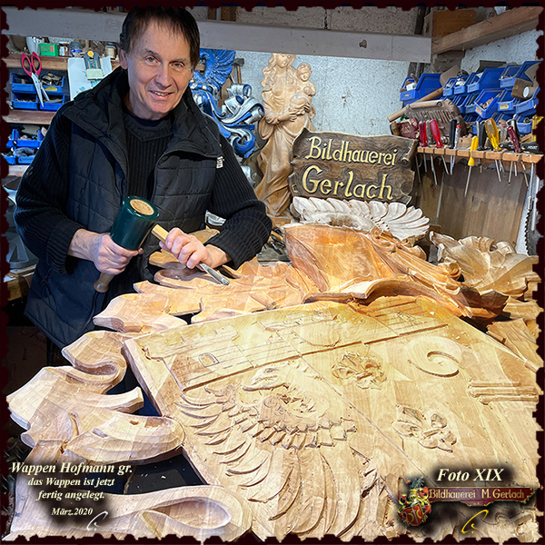 Unter anderem hat er sich auf das Gestalten, Schnitzen und fassen von Wappen aller Art spezialisiert. Seine Wappen sind mit Liebe zum Detail kunstvoll von Meisterhand geschnitzt. Er fertigt jedes Wappen in jeder Art und gewünschten Größe und bereichert somit seine adeligen Kunden die bürgerlichen Familien von Heute über die Zeit hinaus mit einem sichtbaren Zeichen. Ein Zeichen für Familie und Zusammenhalt vererbbar von Generation zu Generation, denn ein Wappen ist wie ein wertvolles Dokument.
