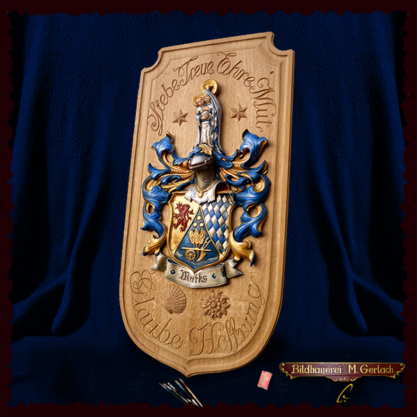 Unter anderem hat er sich auf das Gestalten, Schnitzen und fassen von Wappen aller Art spezialisiert. Seine Wappen sind mit Liebe zum Detail kunstvoll von Meisterhand geschnitzt. Er fertigt jedes Wappen in jeder Art und gewünschten Größe und bereichert somit seine adeligen Kunden die bürgerlichen Familien von Heute über die Zeit hinaus mit einem sichtbaren Zeichen. Ein Zeichen für Familie und Zusammenhalt vererbbar von Generation zu Generation, denn ein Wappen ist wie ein wertvolles Dokument.